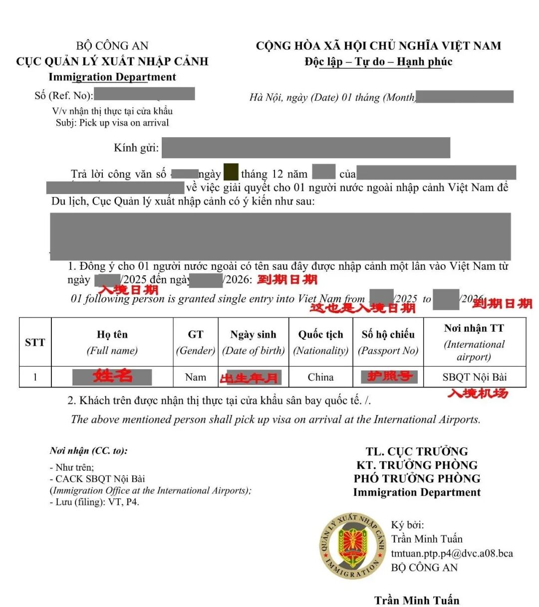 图为落地签证(批文)模板,为不影响出行,收到批文后最好核对下图中翻译的地方,这几个地方正确就没问题。