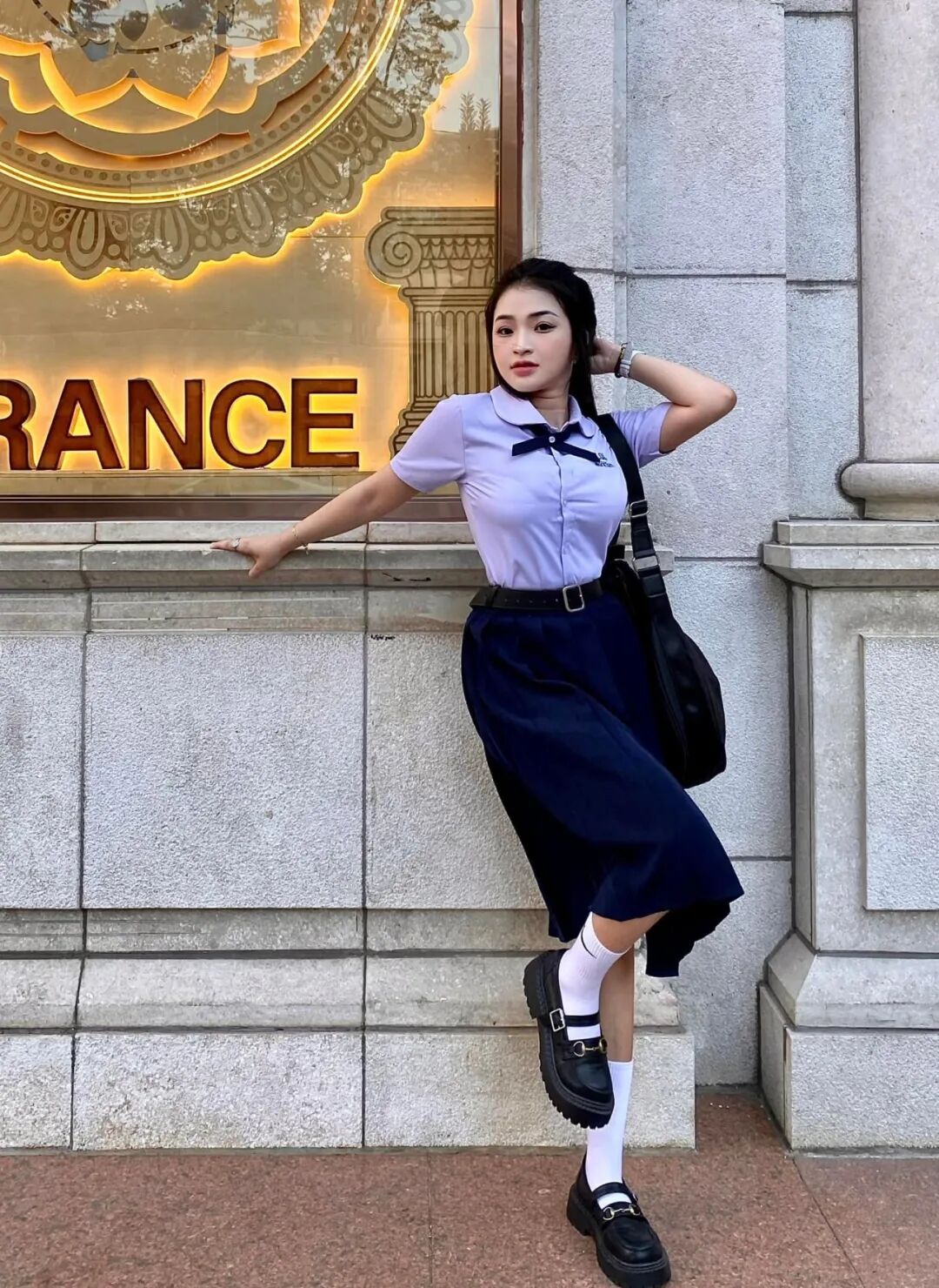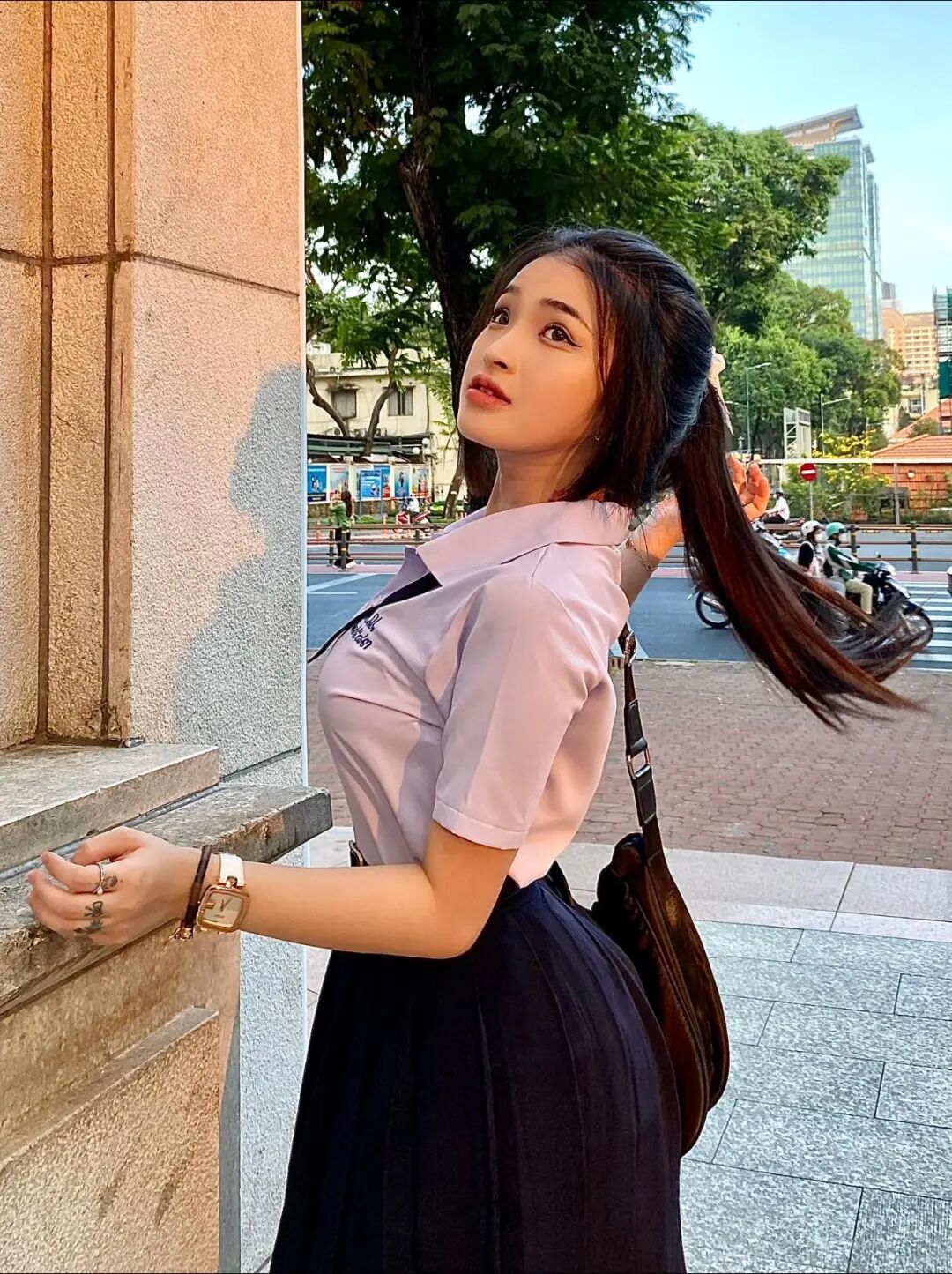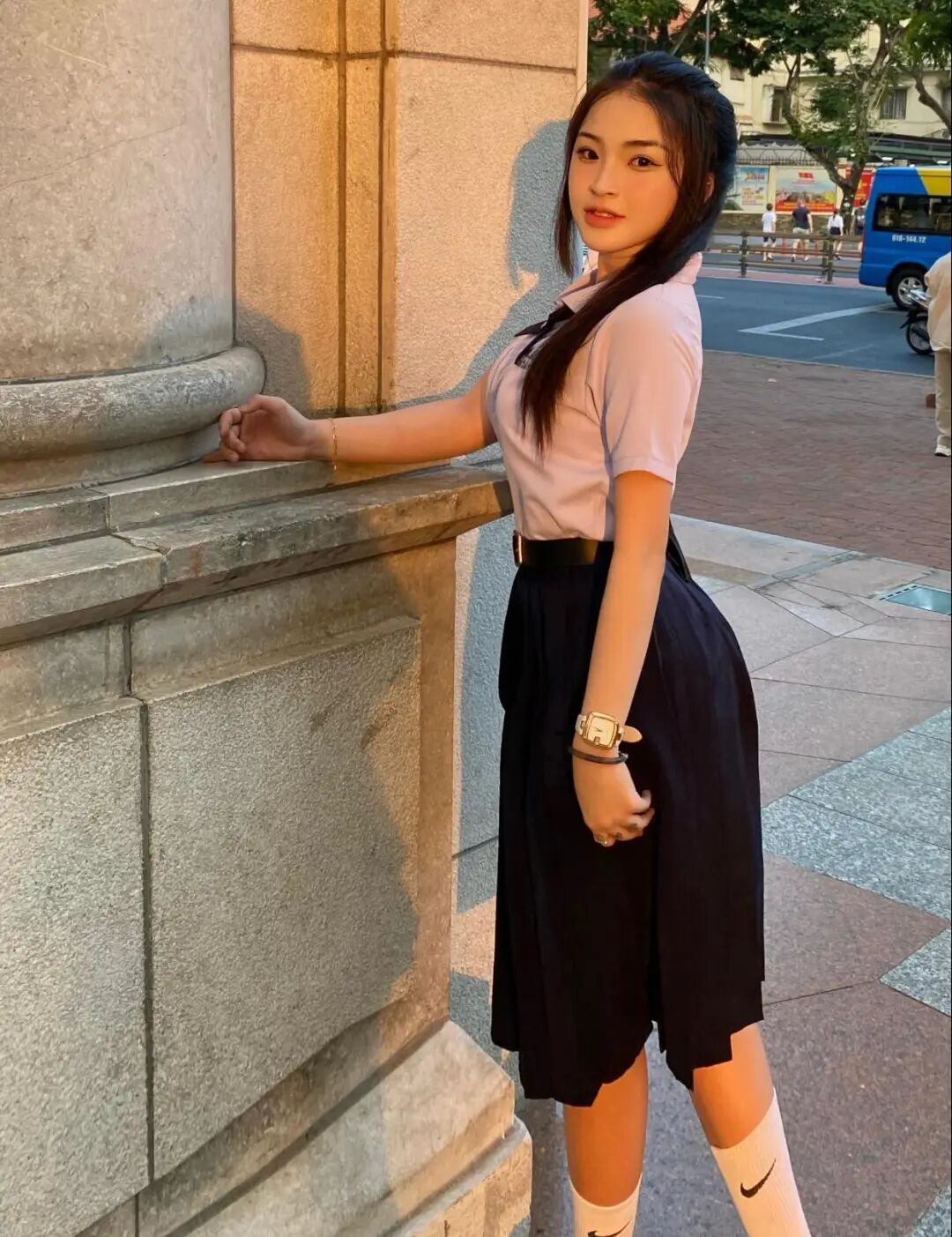 她最出圈的当然还是穿奥黛的样子。越南传统奥黛本来就很挑人——布料贴身、剪裁收腰,对身材和气质要求都高。宝珍穿上它,既有少女的青涩感,又莫名多了一层优雅的女人味,难怪会被反复cue成“同奈奥黛天花板”。但其实她日常穿搭也很会玩:简约T恤+牛仔、oversize卫衣、轻薄连衣裙……每一种风格都能穿出属于她自己的干净利落,不喧宾夺主,却总能让人多看两眼。
