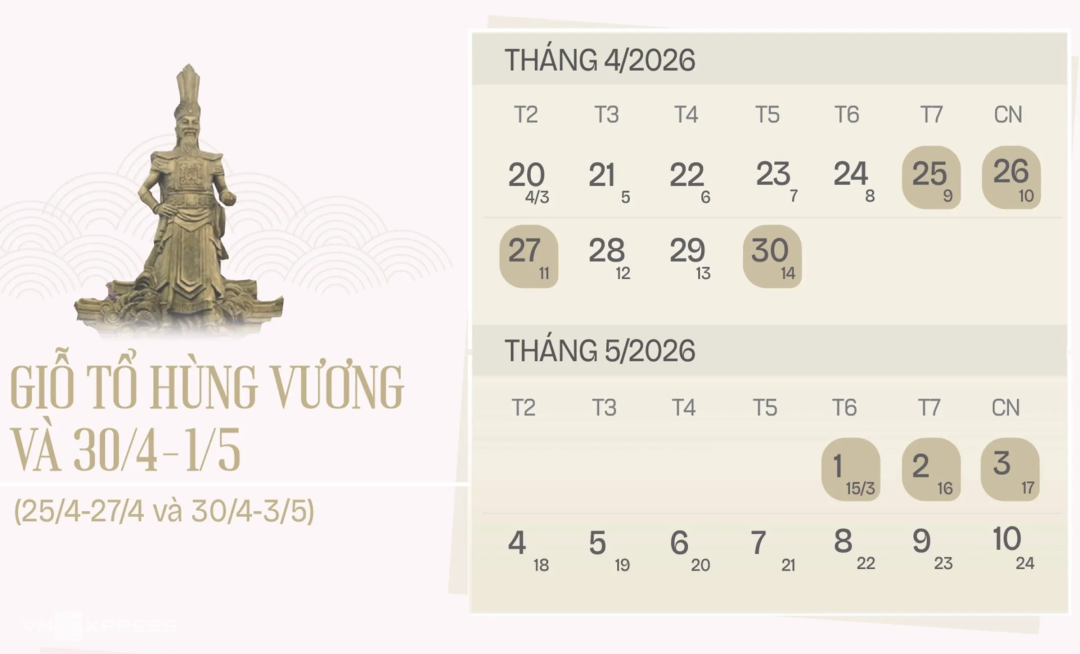 - 雄王纪念日部分:2026年雄王纪念日落在阳历4月26日(星期日),按照劳动法,享受补休。实际连休安排是4月25日至27日连续3天(含4月27日的补休日)。28日、29日正常上班。