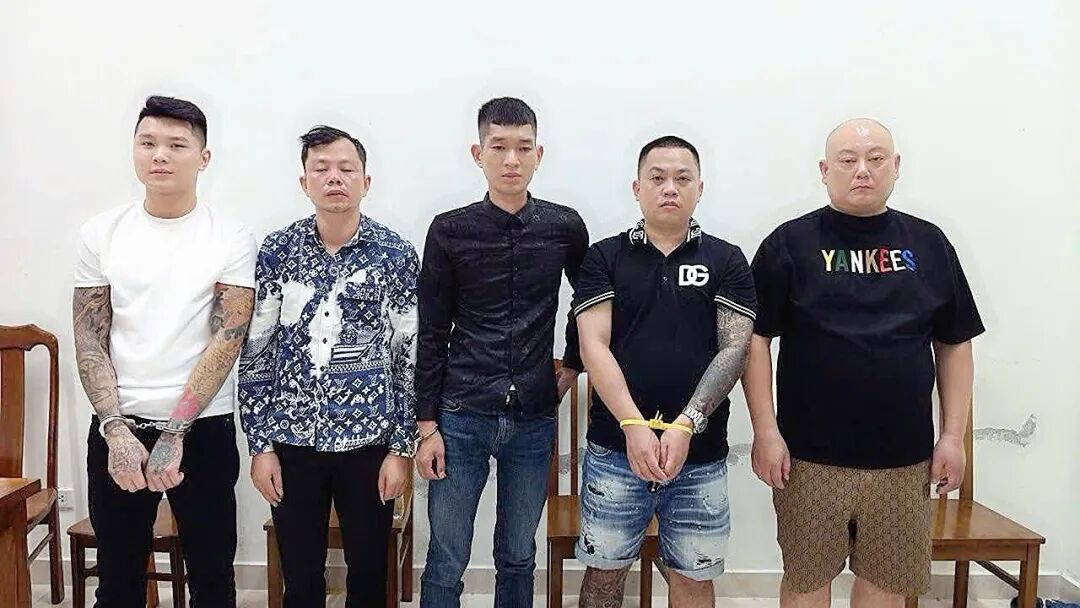 现场,警方逮捕了五名(见上图)嫌疑人,包括一名中国籍男子久某(化名,1979年出生,云南人)以及四名越南本地人:黎文劝(1989年出生)、杜春德(1990年出生)、陈中原(2000年出生)和黄文军(2001年出生),陈中原是广治省人,其它三位都是清化省人。这伙人分工明确,有人负责“催债”,有人负责看守,甚至轮流对受害者施暴,逼迫他们联家人转账还债。吴先生的下颌牙齿被打断,李先生则被恐吓得身心俱疲。
