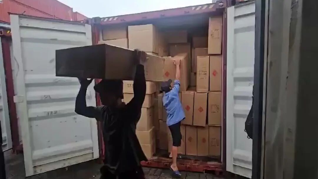 图为从中国走私家具到越南,集装箱被查,现场视频在最下方。