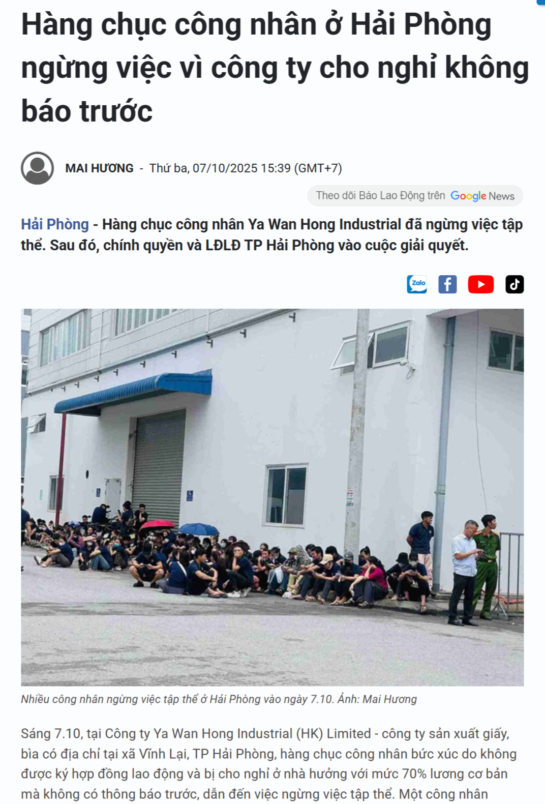 在越南海防市永赖乡的清晨,空气中弥漫着一丝不安的氛围。亚万鸿(音译)公司(Công ty Ya Wan Hong Industrial (HK) Limited),一家生产纸张、瓦楞纸和纸质包装的中资企业,迎来了一个不同寻常的日子。10月7日清晨,上百工人聚集在工厂门前,表达对劳动待遇的不满。这场突如其来的集体停工,不仅让企业管理层措手不及,也将当地政府和工会的目光聚焦于此。这究竟是怎么一回事?让我们走进这场风波的核心,探寻背后的故事。