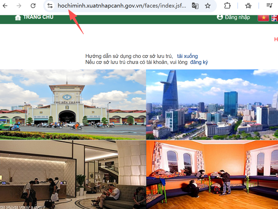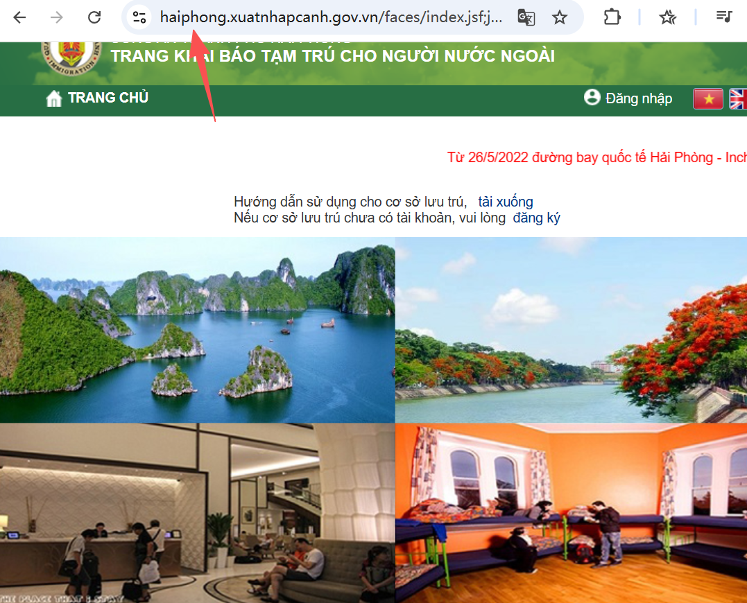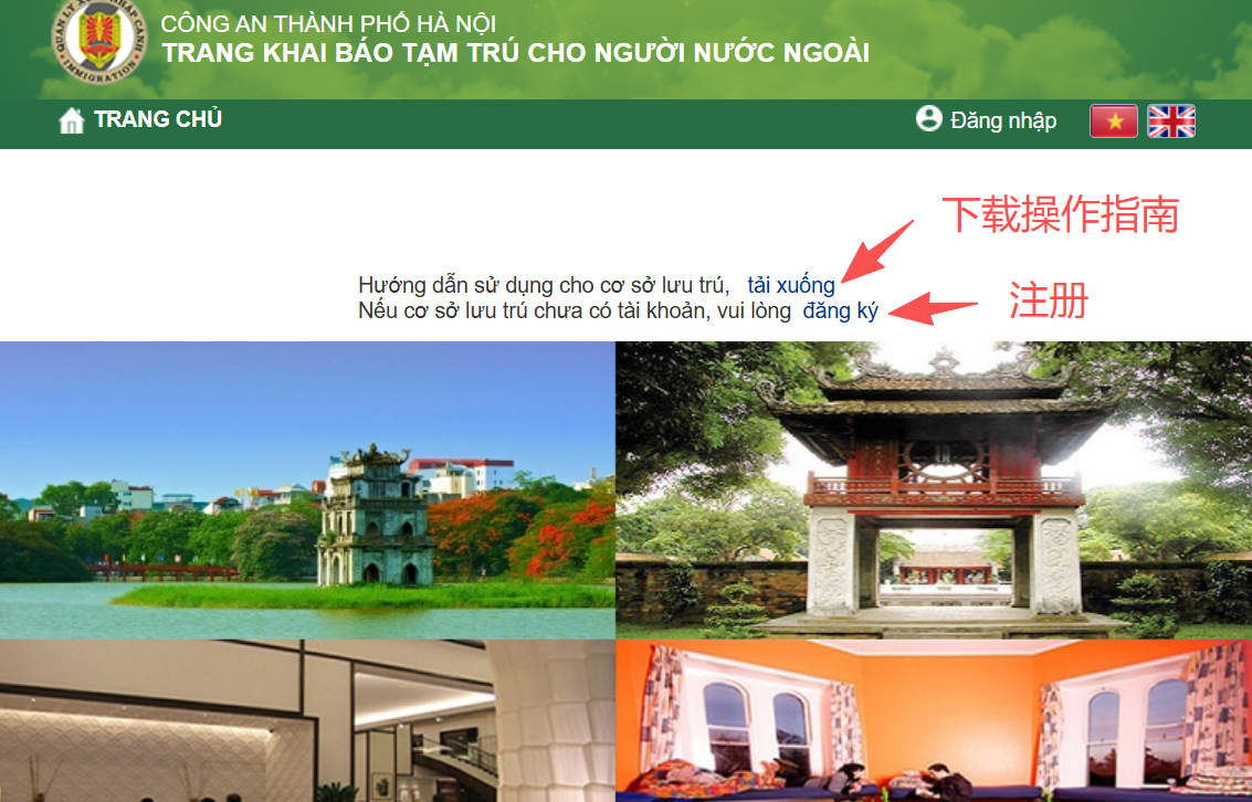 访问所在省/市的公安局移民管理部门临时居留申报网站,注册或登录账号(例如河内的网址:https://hanoi.xuatnhapcanh.gov.vn)。关于这个网址,其它省市的申报网站只需替换.前面的名即可(举例:以下3图),如果要打开胡志明市移民局申报网站,可以把“hanoi ”替换为“hochiminh”。
