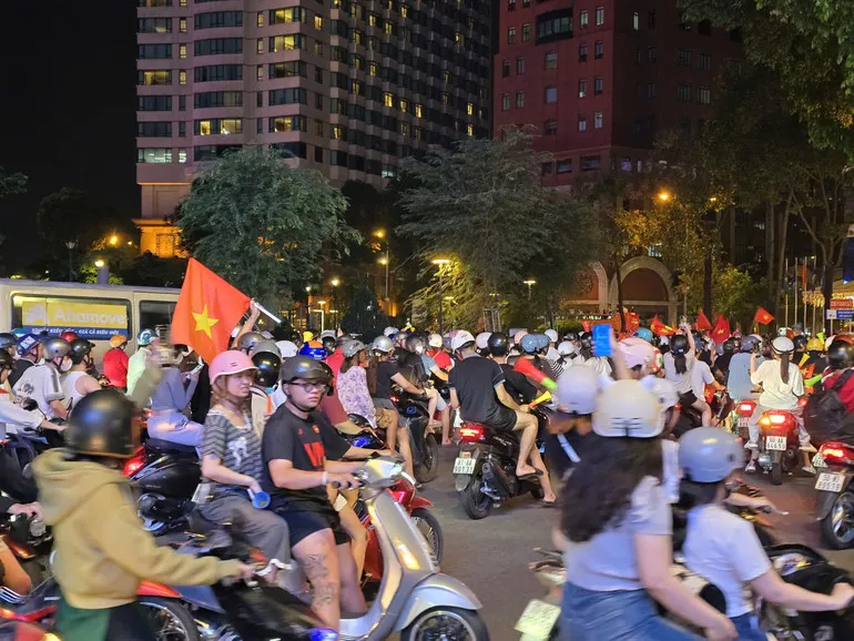 胡志明市那边呢?同样是沸腾的锅!比赛刚结束,夜幕下的街道就挤满了人潮,欢呼声、喇叭声交织成一片,空气中弥漫着胜利的甜蜜。人们盛装打扮,有的甚至cosplay成巫师,手持大托盘游街,庆祝这来之不易的金牌。市中心车队绵延不绝,摩托车上的旗帜在风中猎猎作响,“越南是冠军!”的口号回荡不绝。即便到了深夜,氛围依然热烈如昼,我相信,这不仅仅是庆祝一场胜仗,更是民众对国家队的深情告白。
